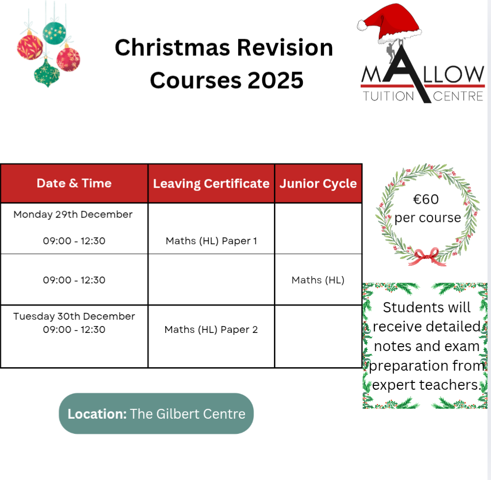 Mallow Tuition Centre is a leading provider of Examination Revision Courses to the students of North Cork for 10 years. In this time hundreds of students have benefited from both the teaching of our outstanding teachers who are all experienced correctors of State Exams and excellent, exam focused notes.